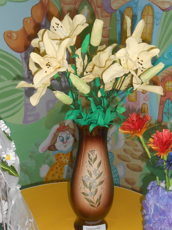 Прошла выставка цветов, из бисера, газетных трубочек и другого бросового материала. Дети своими руками изготовили ромашки и подарили воспитателям и сверстникам, выражая тем самым любовь и заботу друг к другу.