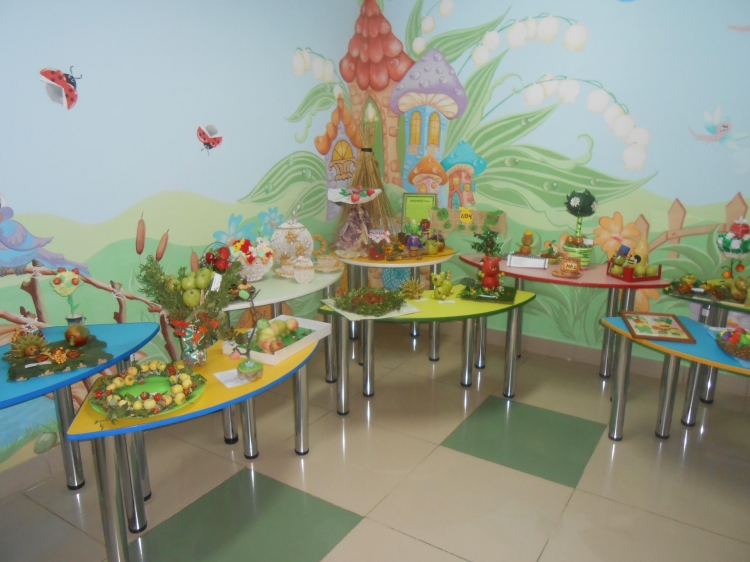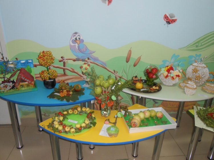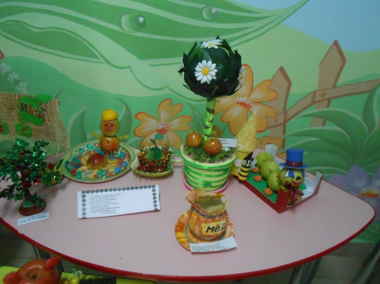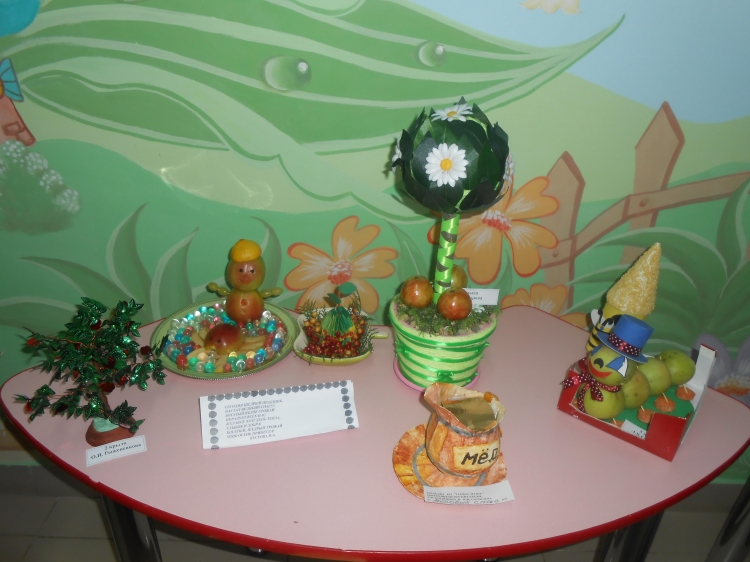 Была оформлена выставка совместно изготовленных воспитателями и детьми поделок из яблок.