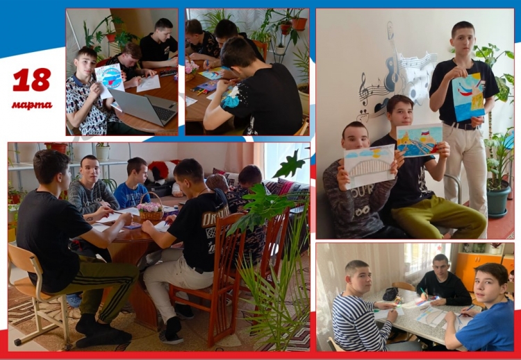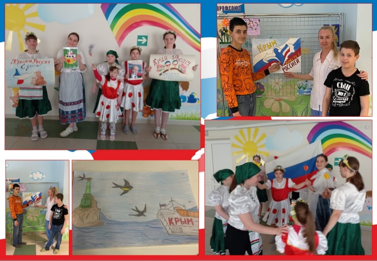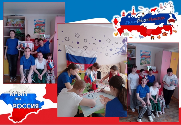 День воссоединения Крыма с Россией 11 лет назад Крым вошёл в состав регионов РФ и в нашем календаре навсегда добавилась еще одна праздничная дата – 18 марта, день воссоединения Крыма с Россией. Мы отмечаем этот день, как большой для нас праздник – «Крымская весна». Не случайно это событие произошло весной, когда пробуждается природа, зарождается новая жизнь, а для России и Крыма наступил новый этап, открылась новая страничка в истории полуострова – радостная и счастливая. С целью формирования у детей патриотических чувств, уважения к истории своей страны и народов, проживающих на территории Крыма, развития интереса к историческим событиям, произошедшим в Крыму 18 марта 2014 года, в нашем детском доме-интернате прошел тематический день, посвященный Дню воссоединения Крыма с Россией. Воспитанникам 5 крыла была представлена презентация «Крым и Россия. Мы вместе», организован показ кинофильма «Наш Крым». Ребята с интересом слушали рассказ об истории Крыма, о событиях, произошедших в марте 2014 года, о достопримечательностях и природе полуострова. На познавательном занятии: «Крым – это Россия» юноши 2 крыла знакомились с символикой региона, изучали флаг и герб, слушали гимн Крыма. Совместно с педагогами выполнили творческие работы по теме, используя различные техники рисования. Для воспитанников 3 и 4 крыла были проведены тематические информационные часы, организована трансляция общероссийского урока «Русская весна». Девочки приняли участие в тематическом занятии «Крым и Россия – общая судьба». Воспитатели рассказали о событиях, предшествовавших присоединению Крыма к России. Вместе с детьми вернулись на несколько лет назад, вспомнив и о предыдущем референдуме, когда крымчане уже делали попытку остаться с Россией. Конечно же, не забыли и о более давней истории полуострова — Екатерина II, Крымская война, Советский Союз, Великая Отечественная война. Была затронута и тема «крымской нации» — пожалуй, именно так можно назвать всех тех, кто называет себя крымчанами, независимо от национальности, вероисповедания и взглядов, ведь Крым — это регион, где на протяжении веков всё смешивалось и роднилось, умиротворяясь удивительной природой и климатом полуострова. Педагоги в доступной для понимания детей форме познакомили их с краткой историей Крыма. Рассказали о событиях 2014г. Несколько ребят с отделения «Милосердие» также приняли активное участие в акциях, посвящённых этому событию, выполняли рисунки, оформляли листовки. В холле учреждения оформлена тематическая выставка. Образовательный, воспитательный и развивающий потенциал всех мероприятий объединила общая цель - развитие чувства патриотизма и гордости за свою страну, формирование Российской гражданской и цивилизационно-культурной идентичности детей и подростков на основе исторических событий, связанных с воссоединением Крыма с Россией.