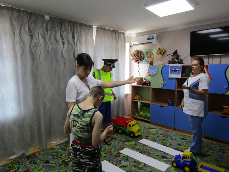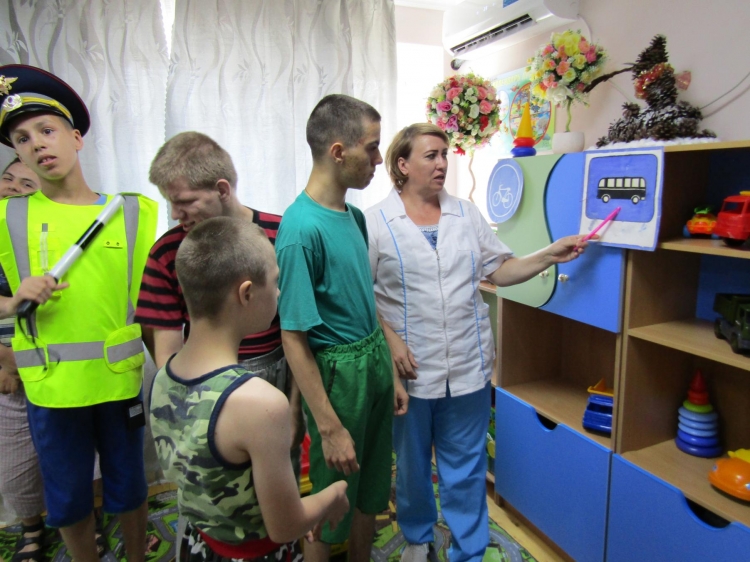 03.07.2018г. Игра-развлечение: «Юные знатоки правил дорожного движения». Безопасность дорожного движения одна из основных проблем сохранения жизни и здоровья детей. За пределами детского дома-интерната дети становятся участниками дорожного движения, поэтому перед воспитателями стоит одна из важных задач – обучение детей с интеллектуальными нарушениями основам безопасного поведения на улицах и дорогах, необходимость сознательного выполнения правил дорожного движения. Во время проведения игры-развлечения воспитатели в игровой форме объяснили детям правила дорожного движения и закрепили на практике навыки поведения в условиях игрового пространства. Объяснили детям правила перехода через дорогу по пешеходному переходу. Познакомили детей со знаками дорожного движения, их символикой, значением.